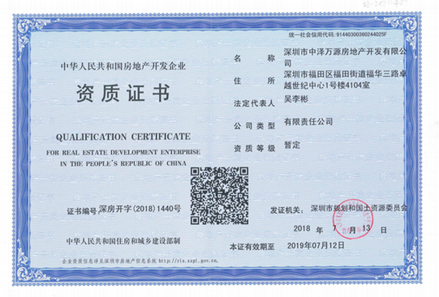 2018年7月20日,深圳市中澤萬源房地產(chǎn)開發(fā)有限公司(以下簡稱“中澤萬源”)成功獲得《中華人民共和國房地產(chǎn)開發(fā)企業(yè)資質(zhì)證書》,這為公司進一步做大做強房地產(chǎn)投資業(yè)務(wù)打下堅實的基礎(chǔ),也為貝悅匯項目下一步順利獲得預(yù)售證提前做好準備。