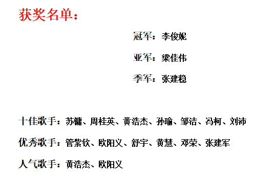 “泰度飛揚(yáng) 同路高歌”決賽現(xiàn)場(chǎng),選手們驚人的唱功,對(duì)音準(zhǔn)和節(jié)奏游刃有余的拿捏,穩(wěn)定發(fā)揮Hold住全場(chǎng)的臺(tái)風(fēng),都讓人眼前一亮。經(jīng)過(guò)3個(gè)多小時(shí)的激烈比拼及評(píng)委的共同商議,由李俊妮、梁佳偉、張建穩(wěn)三位歌手榮獲本場(chǎng)比賽的冠亞季軍。