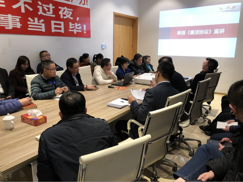 隨后,項目監(jiān)事李光福對新版的廉潔協議條款進行詳細具體地講解。重點強調了員工行為規(guī)范的“十六不得”。具體要求為:不得索要或接受第三方的財務、借款、宴請或各類活動費用,不得利用公司資源接私活,不得侵占公司財務資源,不得損害公司聲譽等展開敘述。并強調,對觸犯以上十六種行為者,公司將根據情節(jié)輕重予以不同程度的懲罰。同時要求各部門負責人更應以身作則,樹立廉潔之風,帶領好自己的團隊。